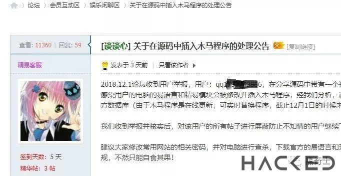 黑奇士查询该论坛发现,客服在12月5日发布官方通告称,“(罗某)在分享源码中带有一个被修改过的精易模块,模块里面包含恶意代码,通过在线下载木马程序对电脑进行感染,被感染用户的电脑的易语言和精易模块会被修改并插入木马程序,经我们分析,这个木马程序主要是监控电脑的键盘记录,包括支付宝、天猫等平台的账号密码并上传到对方数据库”