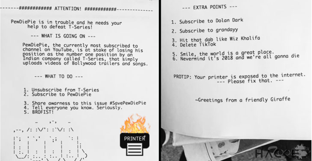 TheHackerGiraffe扫描互联网,使用Shodan找到打开9100端口的易受攻击的打印机列表(Shodan是一个连接互联网设备的搜索引擎),并利用它们发出消息,说:“PewDiePie陷入困境,他需要你的帮助来击败T-Series”